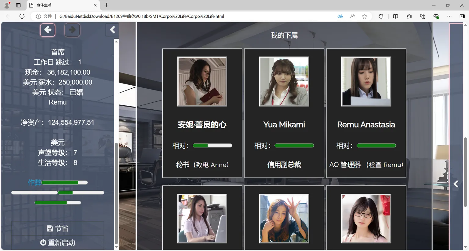 扮演华尔街一家大型银行新聘用的应届毕业生。攀登企业阶梯,成为银行中最有权势的人,并最终成为整个金融行业最有权势的人。结识漂亮的同事和企业无人机伙伴。与他们互动、交朋友和约会。如果幸运的话,您将能够结识名人、约会或与他们发生性关系。大多数扭结是亚洲女孩、办公室爱爱、JAV 和漂亮的脸蛋。